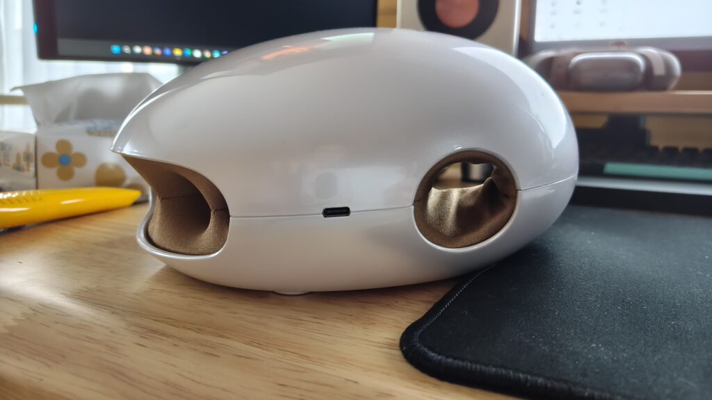 下には手を入れるスペース、上には指が入るスペースがあります。左側には充電用のType-C端子があります。